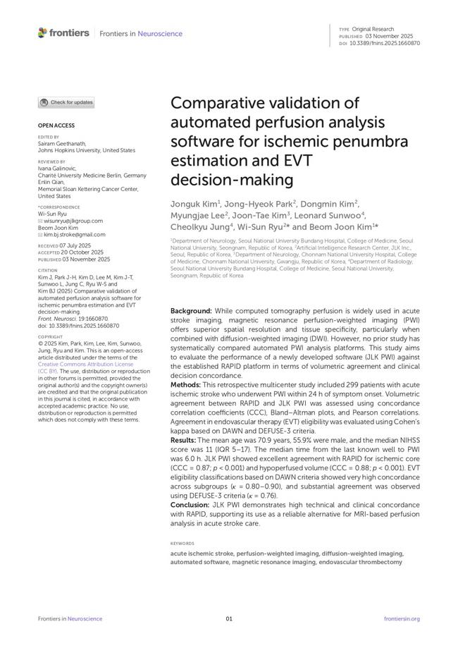 의료 AI 기업 제이엘케이는 자사의 MRI 기반 뇌관류 분석 솔루션이 치료 결정에 활용할 수 있는 수준의 정확성을 입증한 연구 논문이 발표됐다고 밝혔다. 이번 연구는 분당서울대병원과 전남대병원 등에서 급성 뇌졸중 환자 299명을 대상으로 수행됐으며, 국제학술지 Frontiers in Neuroscience에 게재됐다.