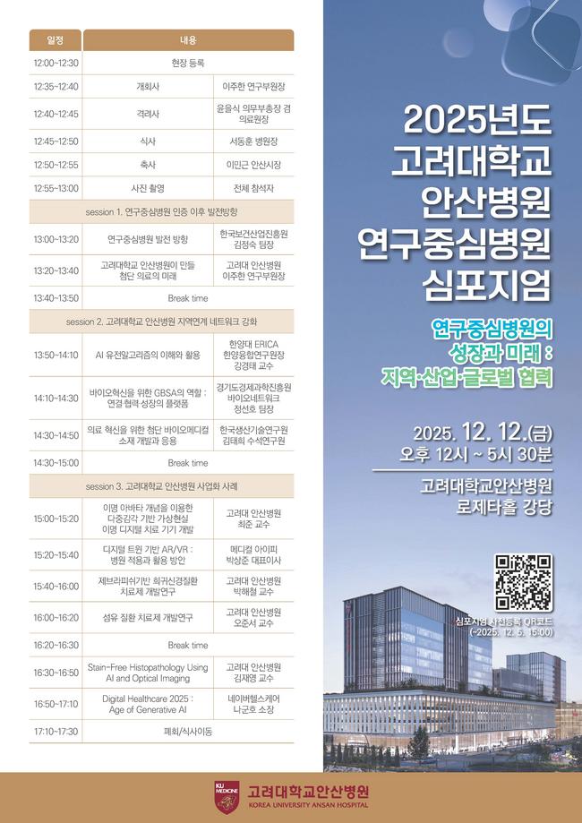 고려대 안산병원은 오는 12일 오후 12시 별관 지하 1층 로제타홀에서 ‘연구중심병원의 성장과 미래: 지역·산업·글로벌 협력’을 주제로 심포지엄을 개최한다. 이번 행사는 병원이 첫 연구중심병원 인증을 획득한 것을 기념하고, 연구 경쟁력 강화와 지역·산업·글로벌 기반 연구 생태계 협력 방안을 논의하기 위해 마련됐다.
