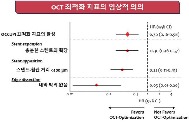 연구팀은 OCT 가이드에 따라 스텐트 시술을 받은 환자 773명을 분석했다. 환자들은 OCCUPI 연구에서 정의한 ‘스텐트 최적화 기준(OCCUPI-OCT criteria)’을 충족한 그룹(최적화군, 71%)과 충족하지 못한 그룹(비최적화군, 29%)으로 나눠 1년간 임상 예후를 비교했다. 스텐트 최적화의 기준은 △충분한 스텐트 확장 △스텐트와 혈관벽의 완전한 밀착 △주요 혈관 박리 없음 등 세 가지 핵심 요소를 모두 만족하는 경우로 정의했다.