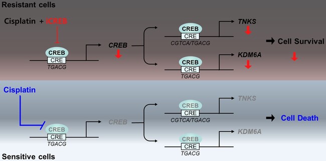 특히 CREB이 조절하는 유전자 중 TNKS와 KDM6A가 시스플라틴 내성과 깊게 연관돼 있으며, 두 유전자의 활성 변화가 항암제 반응성을 결정하는 데 중요한 역할을 한다는 사실도 확인했다.
