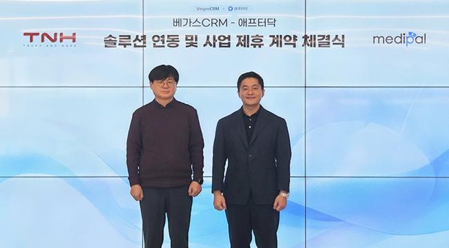 메디팔-'베가스 CRM’ 운영사 티엔에이치 솔루션 연동 및 사업 제휴 계약 체결 기념사진. 이판호 티엔에이치 대표, 강종일 메디팔 대표 (왼쪽부터)