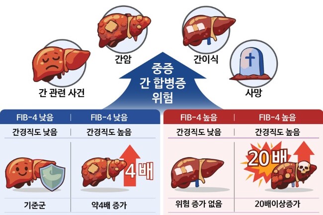 장기간 추적관찰 결과 간부전, 간세포암, 간이식, 사망 등을 포함한 중증 간 합병증 발생 위험은 FIB-4와 간경직도가 모두 낮은 환자군(대조군)에 비해, FIB-4는 낮지만 간경직도가 높은 환자군에서 약 4배 이상 높았다. 두 지표가 모두 높은 환자군에서는 위험도가 20배 이상 증가했다. 반면 FIB-4만 높고 간경직도가 낮은 경우에는 간 관련 합병증 위험이 유의하게 증가하지 않았다.