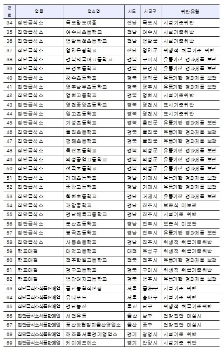 올 상반기 식품위생법 위반으로 적발된 학교·매점·집단급식소 식품판매업체 86곳
