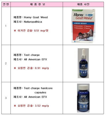 ‘레드루스터’(Red rooster), ‘테스트차지’(Test charge) 등 4개 제품에서는 동물최음제로 사용되는 요힘빈(yohimbine), 이카린(icariin) 성분이 검출됐다.