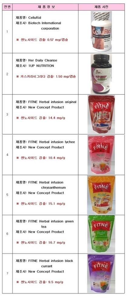 ‘셀룰라이드’(CelluRid), ‘피티네허벌인퓨전’(FITNE Herbal infusion original) 등 다이어트 효과를 표방한 7개 제품은 변비치료제로 사용되는 센노사이드(sennoside), 카스카라사그라다(cascara sagrada)가 나왔다.
