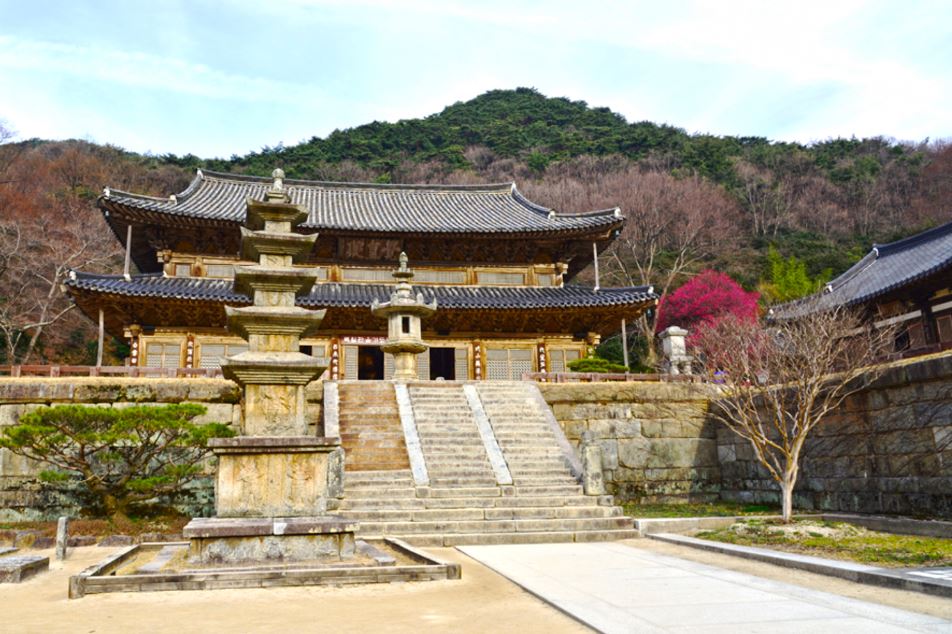 현존하는 목조건물 중 가장 큰 화엄사 각황전과 한켠의 홍매