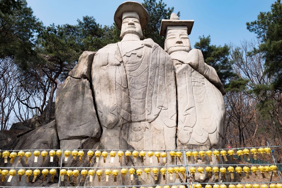 용암사(龍巖寺) 일주문을 지나 108계단을 오르면 소나무 숲 사이로 불상의 모습이 드러나기 시작한다. 거대한 천연 암벽에 새긴 용미리 마애이불입상은 머리 위에는 돌갓을 쓰고 신체 비율도 맞지 않는 등 그동안 보아왔던 정갈하고 섬세하게 다듬어진 마애불과는 달리 토속적이고 투박해 보인다. 지방민들의 구전에 의하면 둥근 갓의 석상은 남상, 모난 갓의 석상은 여상이라 하는데 불상이 아니라 장지산을 지키는 수문장 같다.