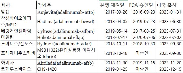 2023년 1월 암젠이 휴미라의 첫 바이오시밀러를 출시할 것으로 예상되며 이후 다른 경쟁사들이 순차적으로 내놓을 전망이다. 유럽에선 2018년 10월에 바이오시밀러 4개가 동시에 출시됐고 2019년 5월에 5번째가 등장했지만 미국은 특허 보호가 강해 난공불락이다.