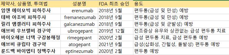 엘러간의 ‘우브렐비’(Ubrelvy 성분명 우브로게판트, ubrogepant)는 2019년 12월, 바이오헤븐의 ‘너텍오디티’(Nurtec ODT, 성분명 리메게판트 rimegepant)는 2020년 2월에 각각 급성 편두통 치료제로 FDA 승인을 받았다.