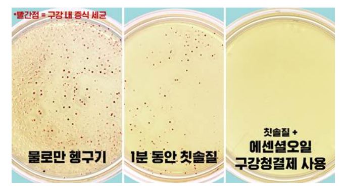 실제로 6개월간 실험했을 때 칫솔, 치실과 함께 에센셜오일 성분의 구강청결제를 함께 사용하면 구강청결제를 사용하지 않는 경우보다 플라크가 52%나 감소하고 치은염이 21% 감소하는 것으로 나타났다.