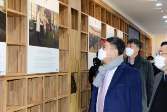구성욱 연세의료원 대외협력처장 (왼쪽)이 메디테리움 의학박물관에서 전시 중인 세브란스 근대화 역사 기록화를 관람하고 있다.(연세의료원 제공).