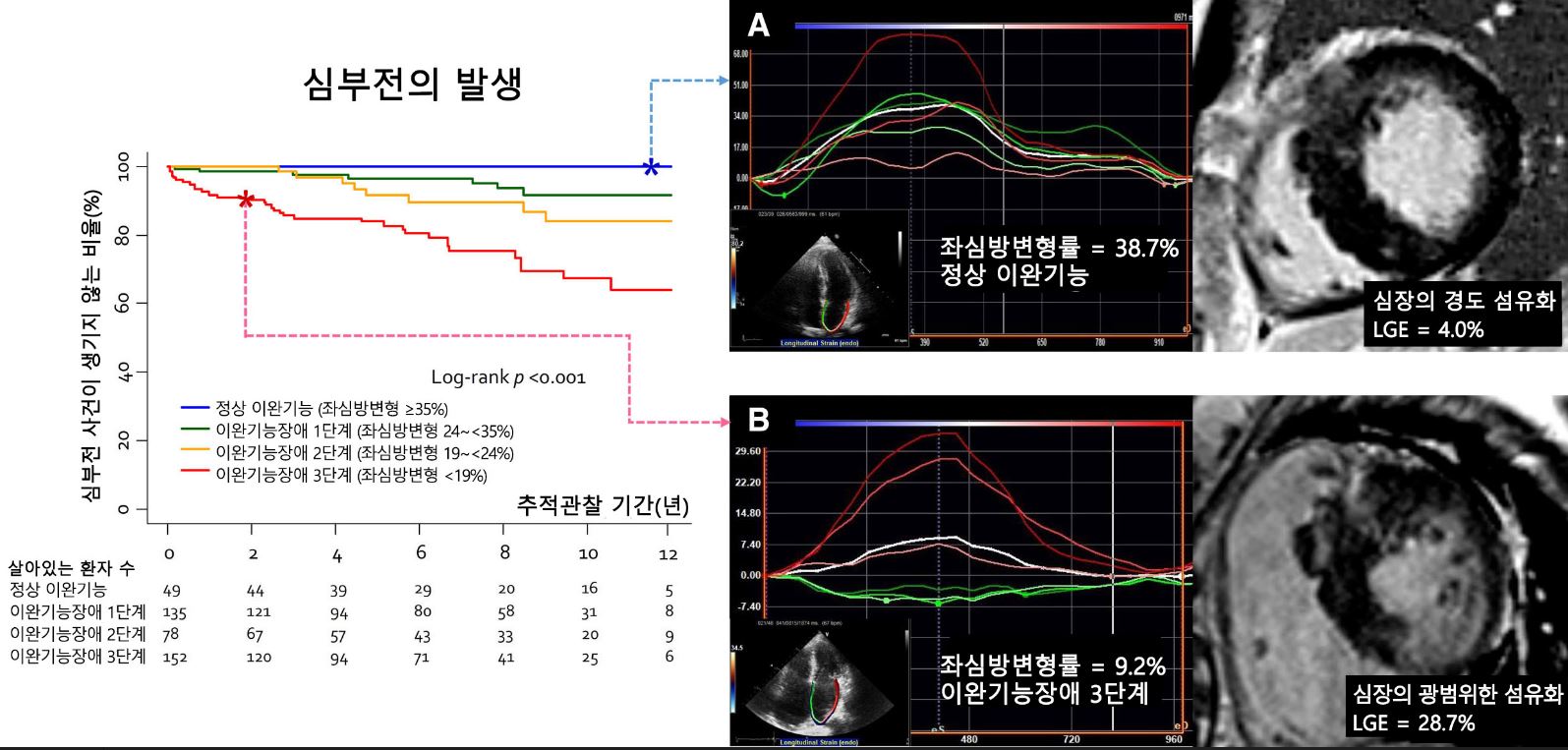 좌심방변형률에 따라 구분된 기능 장애 정도(정상 및 1~3단계) 및 비후성심근증환자의 심부전 관련 무사건 생존율 사이의 관계 [그래프 오른쪽] 비후성심근병 환자 중 (가) 경증 섬유증이 있는 정상 이완기능(좌심방변형률 38.7%)의 56세 남성, (나) 중증 섬유증이 있는 기능장애 3단계 그룹(좌심방변형률 9.2%)의 75세 여성. (서울대병원 제공)