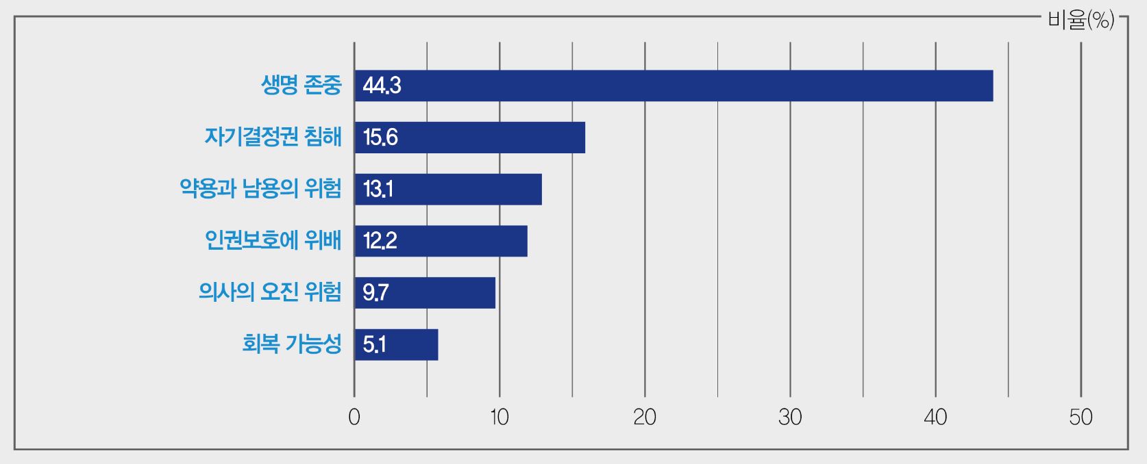 반대 이유로는 △생명존중(44.4%)이 가장 높은 비율을 차지했고 △자기결정권 침해(15.6%) △악용과 남용의 위험(13.1%) 등이 그 뒤를 이었다.