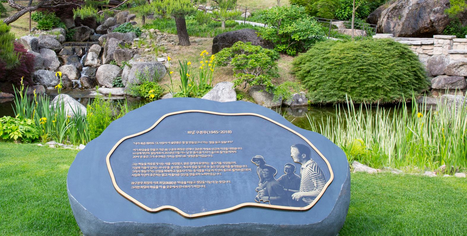 소나무정원의 연못가 비석에는 창업자 ‘화담 구본무’ 회장에 대한 헌사가 새겨져 있다. 화담은 구본무 회장의 아호이기도한데 ‘생명존중’을 추구한 구 회장이 20년에 걸쳐 조성한 숲에 그의 아호를 붙인 것은 어쩌면 당연해 보인다. 생전에 그는 “내가 죽은 뒤라도 ‘그 사람이 이 숲만큼은 참 잘 만들었구나’라는 말을 듣고 싶습니다”라는 말을 남겼다고 한다. 양수경 작가가 쓴 ‘화담’이란 시비도 눈을 끈다.