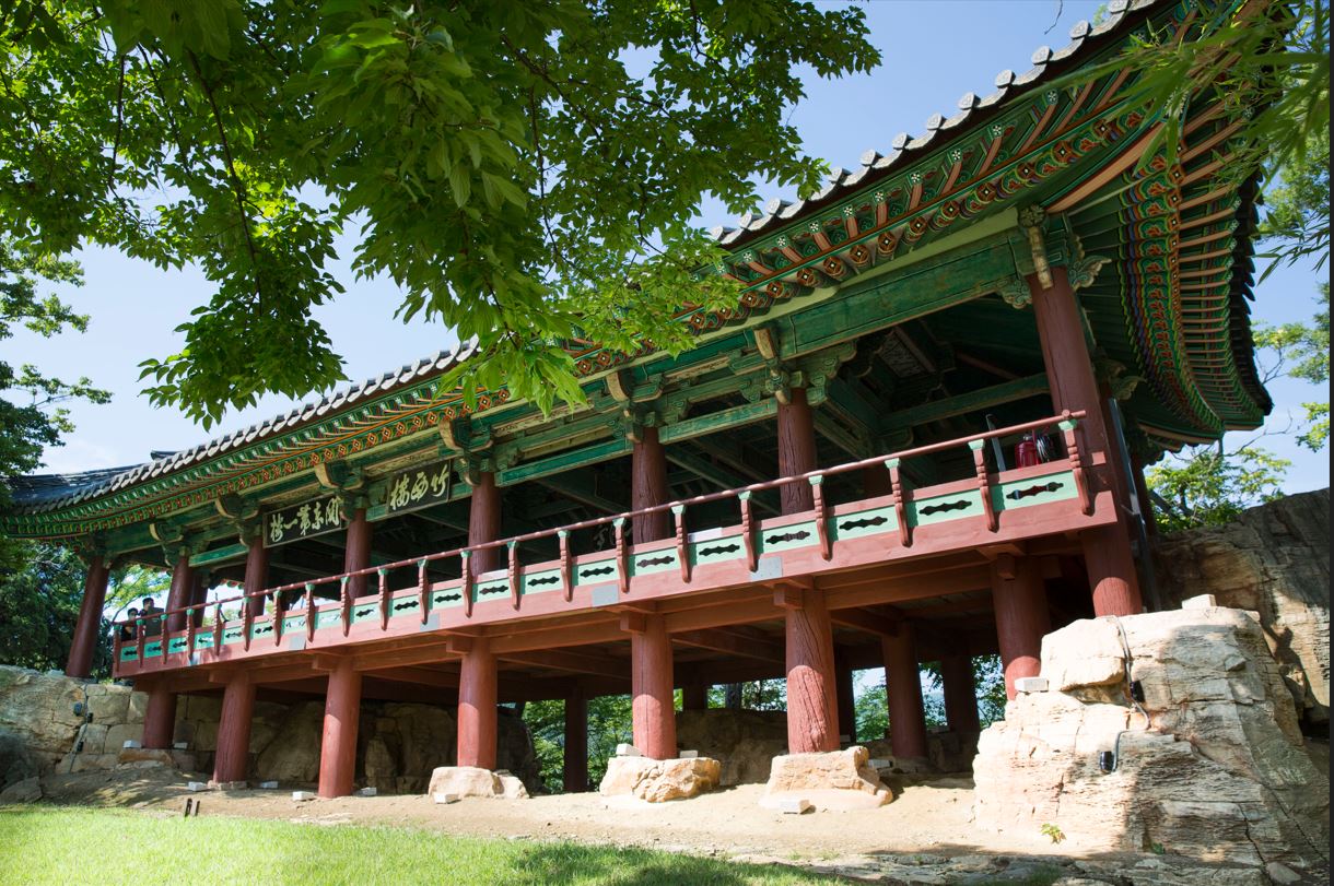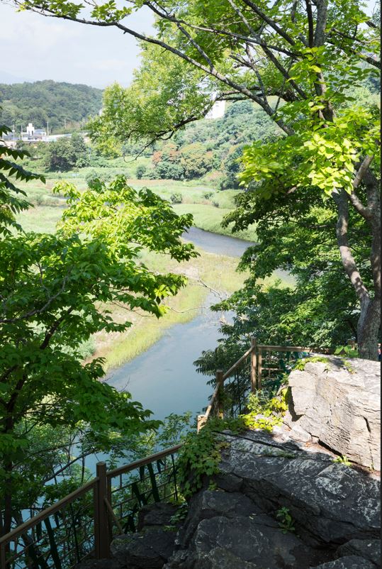 암반 위를 조심스럽게 올라 누각 앞에 서면 불현듯 펼쳐지는 풍광에 감탄이 절로 나온다. 무성한 나뭇잎 사이로 유유히 흐르는 오십천 물길이 그지없이 평화롭기만 하다. 비 갠 봄날의 풍경은 우화등선한 듯 신비감을 자아낸다.