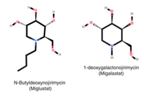 미글루스타트(왼쪽)와 미갈라스타트(오른쪽)의 분자구조식 차이