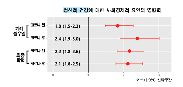 분석 결과, 코로나 대유행 후 낮은 정신사회적 건강에 대한 영향력이 코로나 이전에 비해 증가한 사회경제적 요인은 ‘가계월수입(3천달러 미만)’와 ‘최종학력(고졸 이하)’으로 확인됐다.
