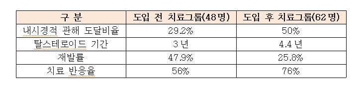 탈스테로이드(Steroid-free) 기간 역시 도입 전 그룹은 3년이었만 도입 후 그룹이 4.4년으로 더 길었다. 재발률을 평가했을 때에도 도입 전 그룹은 47.9%(23명)이었으나, 도입 후 그룹은 25.8%(16명)으로 더 높았다. 90년대 궤양성 대장염의 치료 경과를 밝힌 대규모 해외 연구 사례(IBSEN STUDY)와 비교해서도 인플릭시맵 사용의 이점은 분명했다.