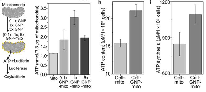 GNP+미토콘드리아 복합체가 미토콘드리아 단독물질보다 ATP 생능력, 함유량에서 우월함을 보여주는 데이터(조미라 가톨릭대 의대 교수 제공)