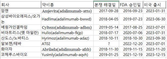 2016년 9월 23일, FDA의 허가를 받은 암제비타는 휴미라의 퍼스트 바이오시밀러다. 휴미라의 물질특허는 가장 핵심적인 물질특허가 2016년에 끝나지만 애브비가 특허 방어를 위해 추가로 132개의 특허를 추가 등록했다. 부차적으로 핵심적인 특허가 2018년 대부분 만료되고, 최종적으로는 모든 특허가 2034년에야 종결된다. 다만 2023년 상반기에 웬만한 핵심특허가 종결됨에 따라 올해부터 바이오시밀러가 풀리기 시작한다.