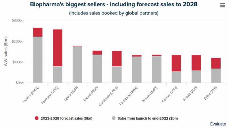 세계 블록버스터 의약품의 출시 이후 누적 매출액 순위.(이밸류에이트파마 집계)