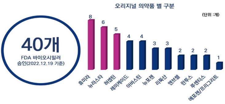 미국에서 허가된 바이오시밀러의 오리지널 브랜드별 분류.(한국바이오협회 집계)