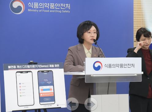 오유경 식품의약품안전처장이 15일 오전 충북 청주시 식약처 회의실에서 국내 첫 불면증 디지털 치료기기 허가와 관련해 브리핑하고 있다. (식약처 제공)