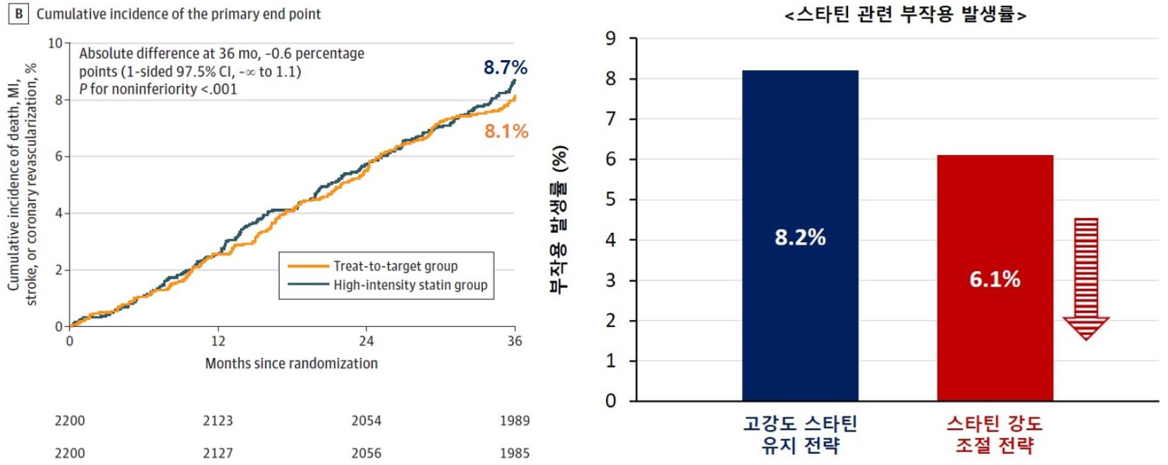 임상 추적 3년 동안의 임상경과 비교 결과 스타틴 강도 조절 전략과 고강도 스타틴 전략 간 유의미한 차이를 보이지 않았다(A), 반면 스타틴 관련 부작용 발생률의 경우 고강도 스타틴 유진 전략군 8.2%, 스타틴 강도 조절 전략군은 6.1%로 강도 조절 전략군에서 부작용 발생이 유의하게 감소함을 확인했다(B)