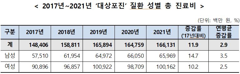 ‘대상포진’ 환자의 건강보험 총 진료비는 2017년 1천484억원에서 2021년 1천661억원으로 2017년 대비 11.9%(177억 원) 증가했고, 연평균 증가율은 2.9%로 나타났다.