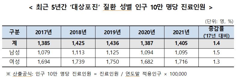 진료인원은 2017년(705,661명)부터 2021년(722,257명)까지 2.4%가 증가했고, 연평균 증가율은 0.6%로 나타났다. 2017년 대비 남성은 2.2%(6,027명), 여성은 2.5%(10,569명) 증가했다.