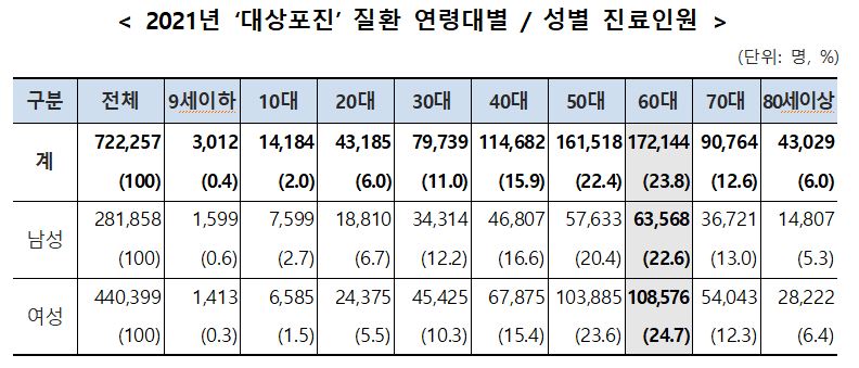 2021년 기준 ‘대상포진’ 환자의 연령대별 진료인원 구성비를 살펴보면, 전체 진료인원(722,257명) 중 60대가 23.8%(172,144명)로 가장 많았고, 50대가 22.4%(161,518명), 40대가 15.9%(114,682명) 순이었다.