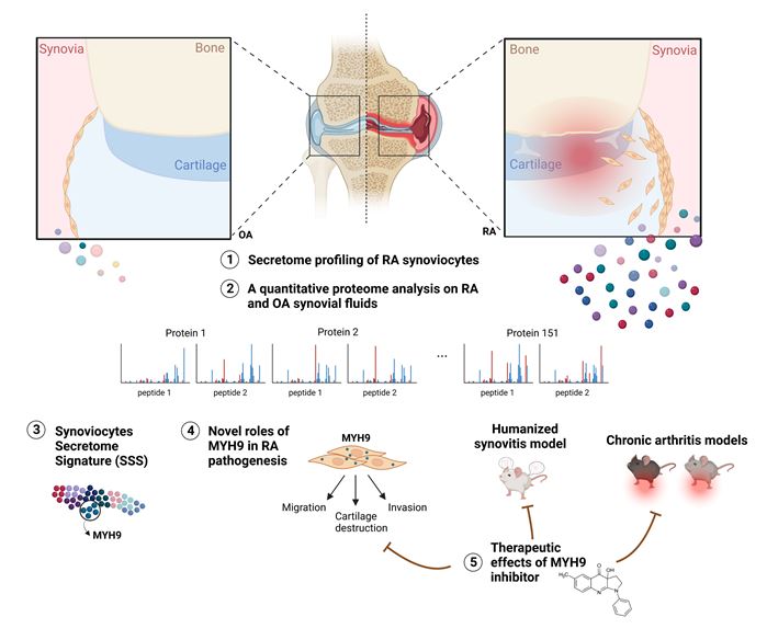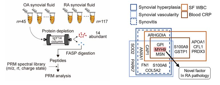 김 교수팀이 제시한 총 16개의 SSS 단백질 중, 미오신 중쇄 9(MYH9)는 SSS 단백질 선별을 위한 모든 조건을 충족하면서 류마티스 관절염에서 그 역할이 보고된 바 없는 새로운 단백질로 확인돼 심층 연구를 수행했다. MYH9는 세포 내의 액틴 사슬과의 직접적인 상호작용을 통해 세포의 다양한 기능과 행동에 관여하는 것이 알려져 있다.