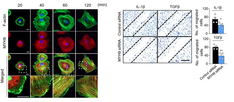 특히 연구팀은 주요인자 MYH9의 활막세포의 이동성과 침윤성에 대한 역할을 세계 최초로 규명하고, MYH9에 대한 저해제 blebbistatin을 통해 류마티스 관절염 치료에 대한 새로운 방법을 제시했다.