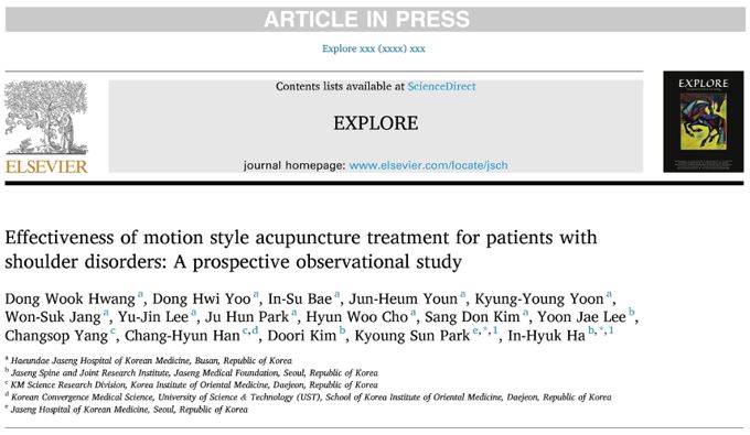 ‘EXPLORE (IF = 2.358)’에 게재된 해당 연구 논문 「Effectiveness of motion style acupuncture treatment for patients with shoulder disorders: A prospective observational study」
