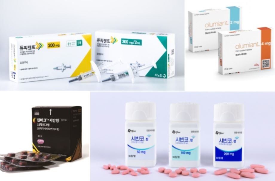 아토피피부염 치료제로 허가받은 사노피 ‘듀피젠트’(윗줄 왼쪽부터), 릴리 ‘올루미언트’, 화이자 ‘시빈코’, 애브비 ‘린버크’