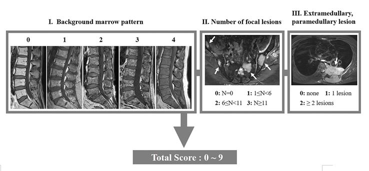 다발골수종의 핵심 3가지 영상 소견인 △배경(Back ground) 골수 패턴 △국소적 골병변의 개수 △골수 외 또는 골수 주변 병변의 유무와 개수를 통합한 점수 체계