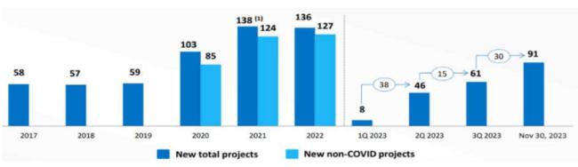 지난해 12월 우시바이오로직스의 투자자 대상 발표 자료에 따르면, 2023년에도 우시바이오로직스는 지속적으로 글로벌 바이오의약품 CDMO 점유율을 늘려나가고 있다. 반면 신규 수주 건수는 2022년 136건으로, 2021년 138건 대비 2건 줄었다.