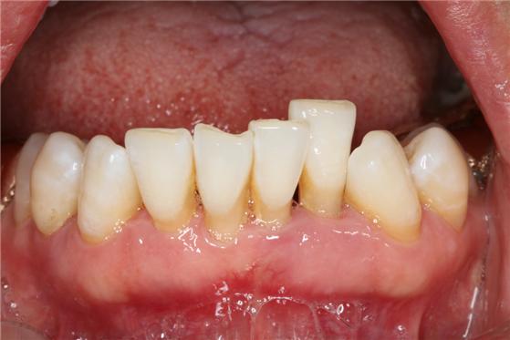 치주질환 및 정출로 인해 잇몸이 퇴축되고 치아 뿌리가 상당 부분 노출된 환자의 모습