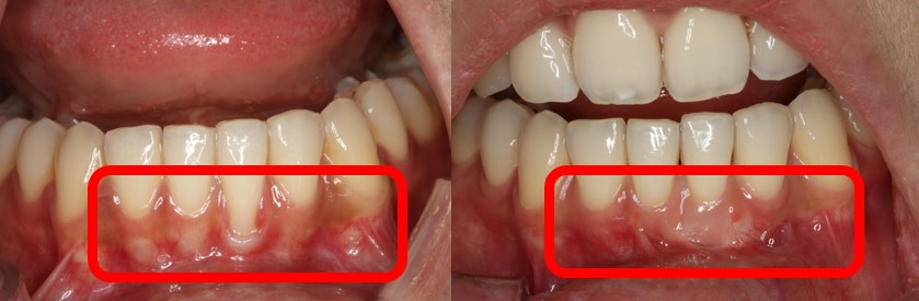 잇몸이식술을 통해 노출된 치근면을 덮기 전(왼쪽)과 치료 후 모습(오른쪽)