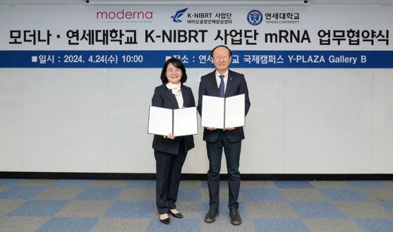 연세대 K-NIBRT 사업단(Korean National Institute for Bioprocessing Research and Training; 한국형 바이오공정인력양성센터)은 지난 24일 모더나코리아(이하 모더나)와 mRNA 교육 콘텐츠 및 프로그램 개발을 위한 협약을 체결, 본격적인 교육과정 운영에 나서기로 했다.