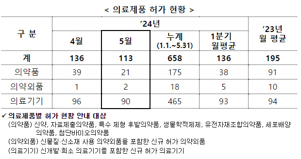한편 지난해 월평균 의료제품 허가 건수인 195개 품목 대비 57.9% 수준이었고, 앞선 4월의 허가 건수 136개 품목 대비 17.0% 감소했는데 특히 의약품이 4월 대비 46.2% 감소한 21건 허가됐다.