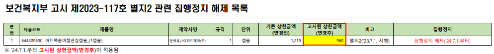 1심 판결에서 제약사가 폐소함에 따라 상한금액인하 집행정지 결정(2024.2.2.)에 따른 상한금액인하 고시의 효력정지가 7월 1일 해제됨에 따른 조치다.