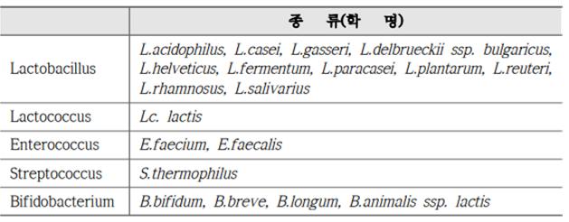 19종의 고시형 프로바이오틱스는 10년 이상 추가되거나 제외된 게 없이 유지되고 있다. 이를 속(屬)에 따라 구분하면 락토바실러스(Lactobacillus) 11종, 락토코쿠스(Lactococcus) 1종, 엔테로코쿠스(Enterococcus) 2종, 스트렙토코쿠스(Streptococcus) 1종, 비피더스(Bifidus, 또는 비피도박테리움, Bifidobacterium) 4종 등이다.