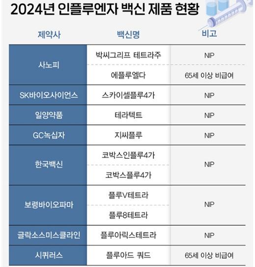 독감예방백신은 국내에서 사노피파스퇴르, 글락소스미스클라인(GSK), CSL시퀴러스 등 3개 다국적제약사와 SK바이오사이언스, GC녹십자, 보령바이오파마, 한국백신, 일양약품, 메디팁(시퀴러스 백신 유통사) 등 6개 토종제약사가 내놓고 있다.