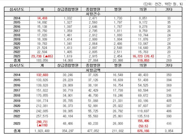 2014~2023년 10년간 종별 의료기관 항우울제 처방건수 및 처방금액 현황(출처 건강보험심사평가원)최근 10년간 종별 처방건수 및 처방금액 현황에 따르면 처방건수는 2014년 총 1441만8000건에서 2023년 2373만 8000건으로 약 65% 증가했고, 처방금액도 같은 기간 1326억원에서 2907억원으로 약 119% 증가했다.