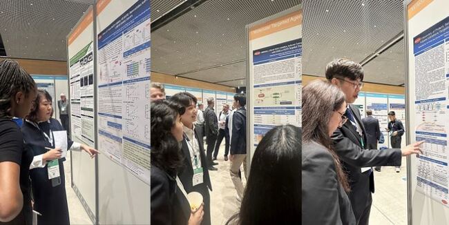 곽은주 한미약품 R&D센터 곽은주 연구원(왼쪽부터), 박원기 연구원, 유형석 연구원이 국제 암 학술대회 ‘EORTC-NCI-AACR 2024’에서 차세대 항암 신약의 연구결과 3건이 담긴 포스터 내용을 설명하고 있다.