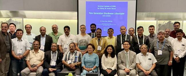휴온스메디텍이 인도 뉴델리에서 열린 ‘SIU 2024’에 참가해 체외충격파쇄석기 ‘URO-UEMXD’를 선보였다. ‘ESWL의 최신동향’ 주제 발표 후 참관객들이 기념촬영을 하고 있다.