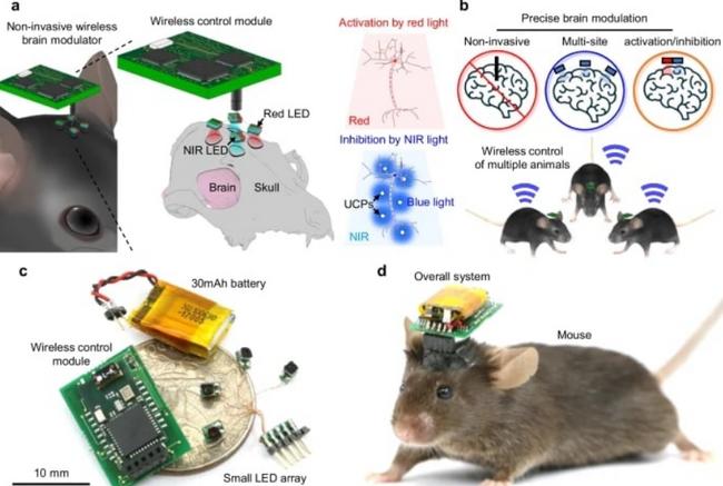 기존 비침습적 뇌 전기자극 기술은 자극 범위가 넓고 정밀한 조절이 어려워, 치료 효과에 한계를 보였다. 연구팀은 이런 한계를 극복하고자 광민감 단백질(opsins)과 상향변환입자(upconversion particle. UCPs)를 활용해 밀리미터 범위 내의 뇌 영역에서 신경세포를 활성화하거나 억제하는 새로운 시스템을 개발했다. 즉 적색광으로 신경을 활성화하고(ReaChR 옵신 자극), 근적외선(NIR)으로 신경활동을 억제(stGtACR2 옵신 자극)하는 양방향 조절 방식을 구현했다. 초소형 무선 광전자 장치를 개발해 실험동물이 자유롭게 움직이는 상태에서도 휴대폰으로 여러 뇌 부위에서 정밀한 신경조절이 가능하게 했다.