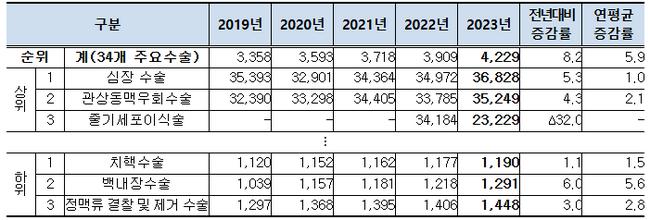 34개 주요수술의 총 진료비는 8조4404억원으로 집계됐다. 이는 전년 대비 4.4% 증가한 수치다. 진료비용은 5년 간 연평균 5.9% 증가했다.