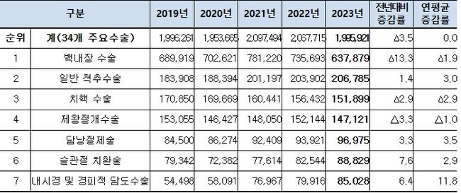 국민건강보험공단은 16일 2023년 주요수술 통계연보를 발간했다고 밝혔다. 지난해 34개 주요수술 건수는 총 199만5921건으로 전년보다 3.5% 감소했다.